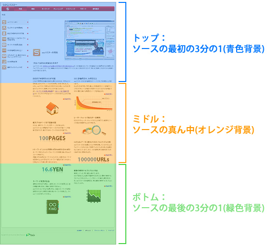 キーワードのポジションバランスをチェックするために、まずソース内の<body>タグ内を3等分にします。