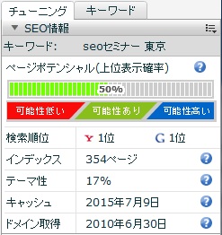 ページポテンシャルは、入力したキーワードにおいてGoogleで1ページ目(1~10位)に表示されているウェブページのGoogle評価と現在表示しているウェブページのGoogle評価を比較して、入力キーワードでの上位表示の可能性を表示しています。もし、ページポテンシャルが低く上位表示の可能性が低いページとキーワードの組み合わせの場合は、キーワードを変更することをお薦めします。
