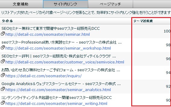 seoマスターProfessionalは、SEOするキーワードに関連性の高いページをサイト内から自動で抽出し、関係性の高い順にリストアップします。リストアップされたページから対象ページヘリンクを張ることで、効率的にサイト内リンク強化を行うことができます。