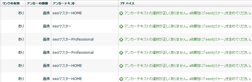 アドバイスで改善点が表示された場合は、改善アドバイスに従ってページを改善してください。なお、改善するリンクは、ページのhtmlソースで一番最初に出現するリンク(ファーストリンク)だけでOKです。