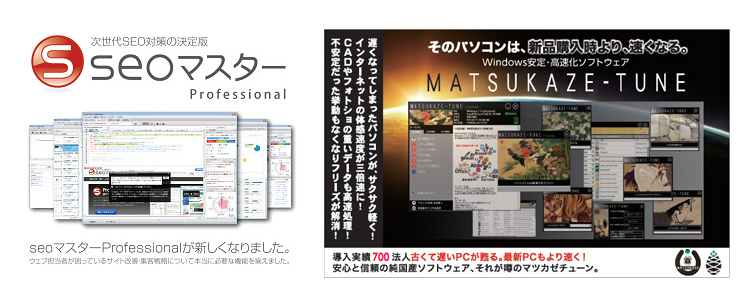 | 特典 | seoマスターProfessional 5,000円割引券と、MATSUKAZE―TUNE1ライセンス(@5,000円税別)をプレゼントいたします。 |